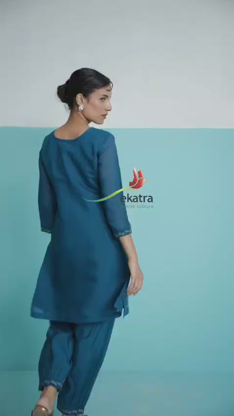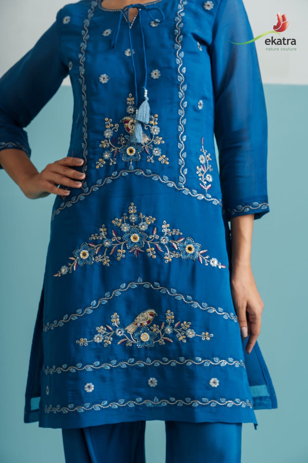 This elegant two-piece royal blue co-ord set features a straight-fit kurta and matching pants. The kurta is beautifully detailed with intricate floral and geometric embroidery and delicate beadwork, creating a sophisticated and graceful look. This stylish and comfortable set is perfect for a refined daytime event or a semi-formal occasion.