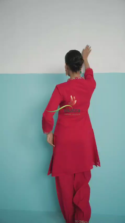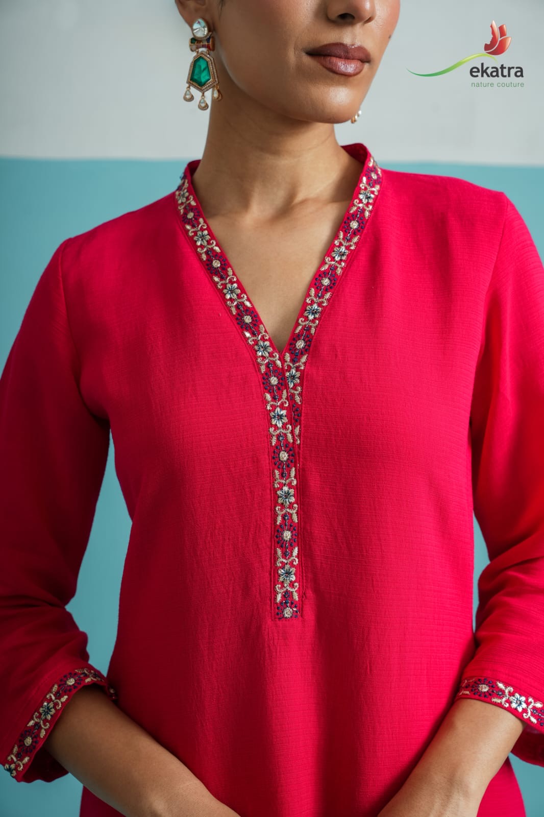 Make a bold statement with this vibrant two-piece pink co-ord set. The elegant kurta and matching bottoms are accented with intricate elephant motifs and delicate floral embroidery along the hem and V-neckline. This stylish and comfortable set is perfect for adding a pop of color to any festive or semi-formal event.